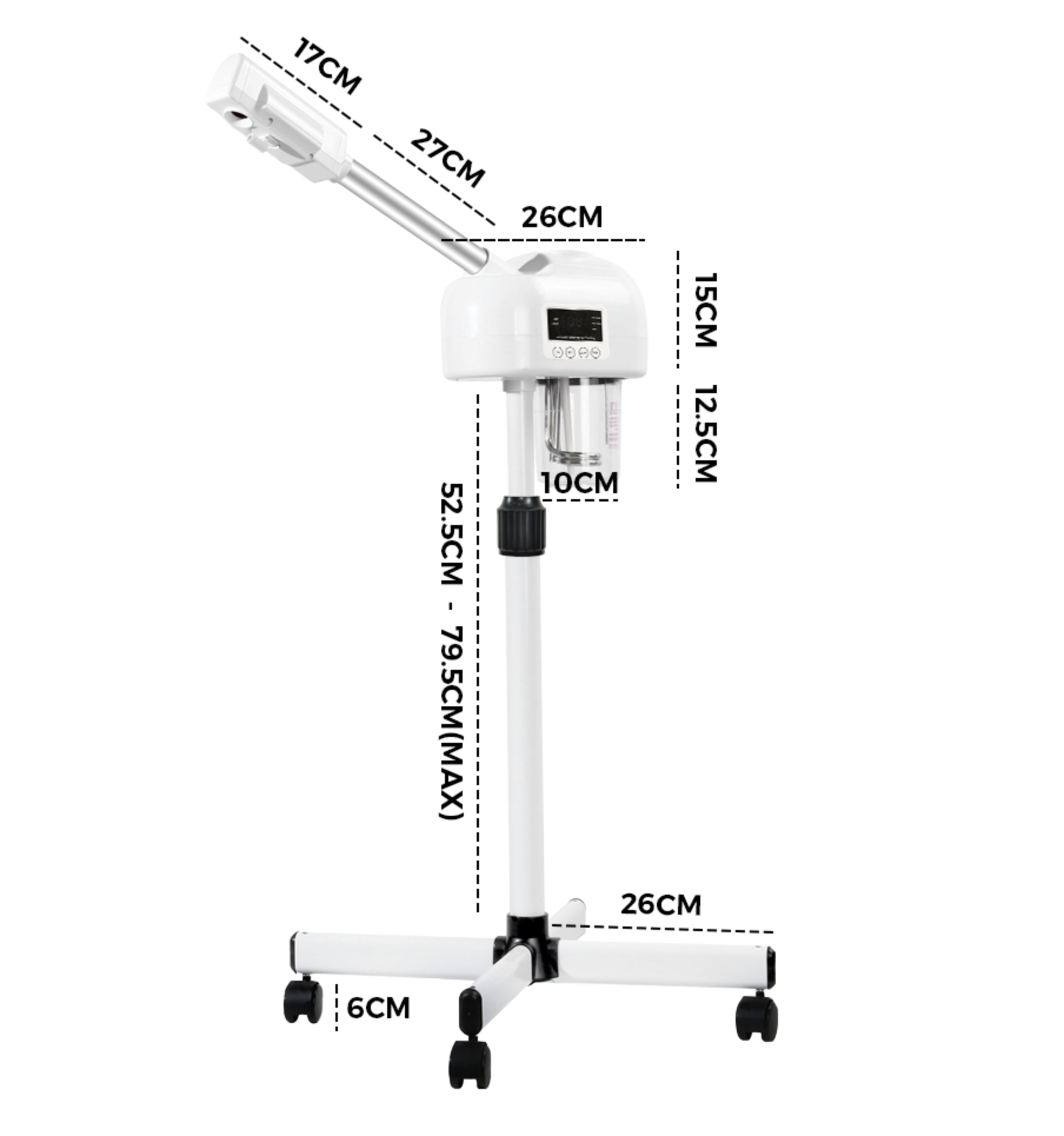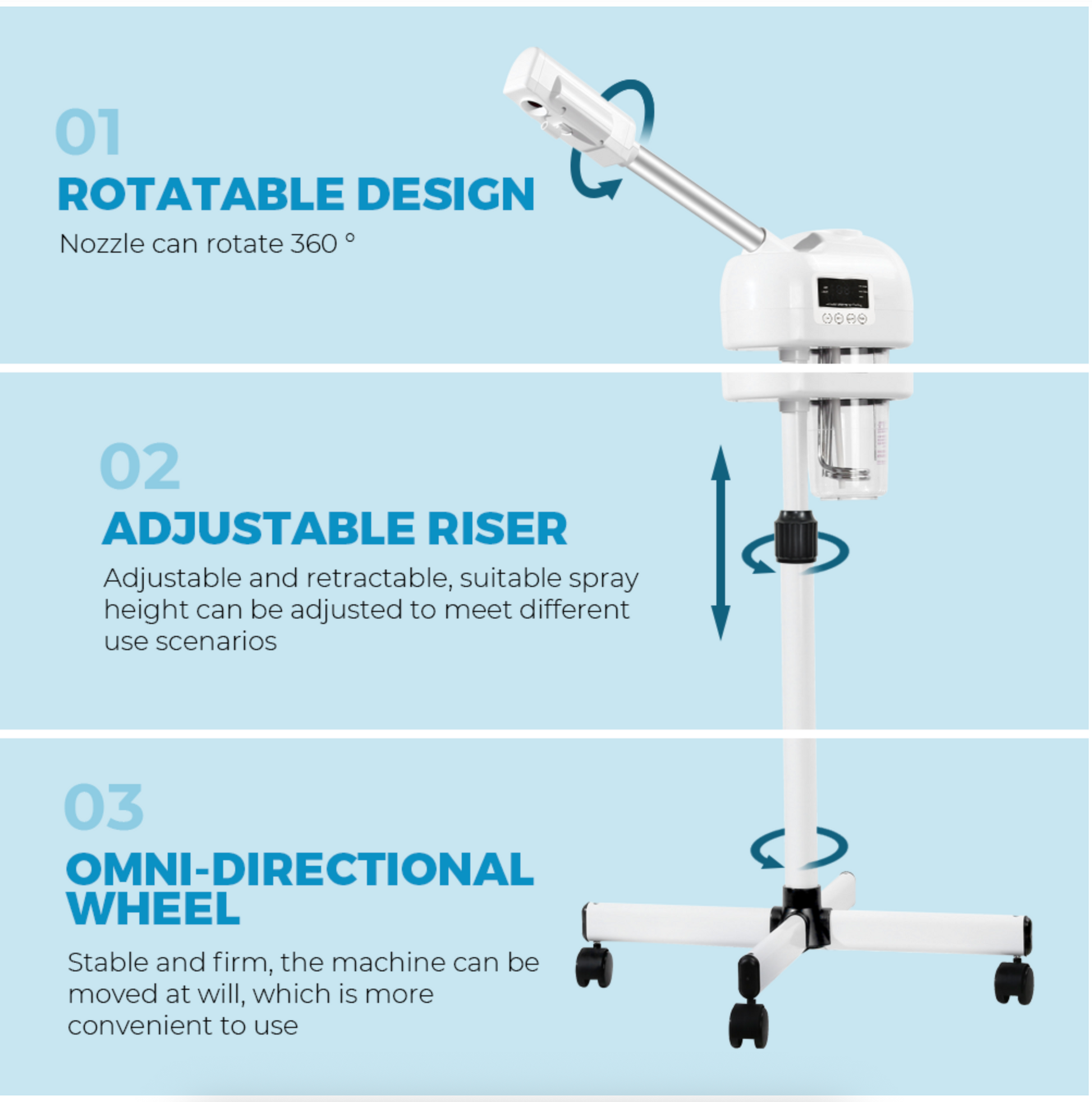 Height Adjustable: Easily adjust the height of the steamer to meet your personal or client's needs. The adjustable feature ensures comfort during treatments, whether you're sitting or standing. This flexibility makes the machine suitable for different facial positions and users.